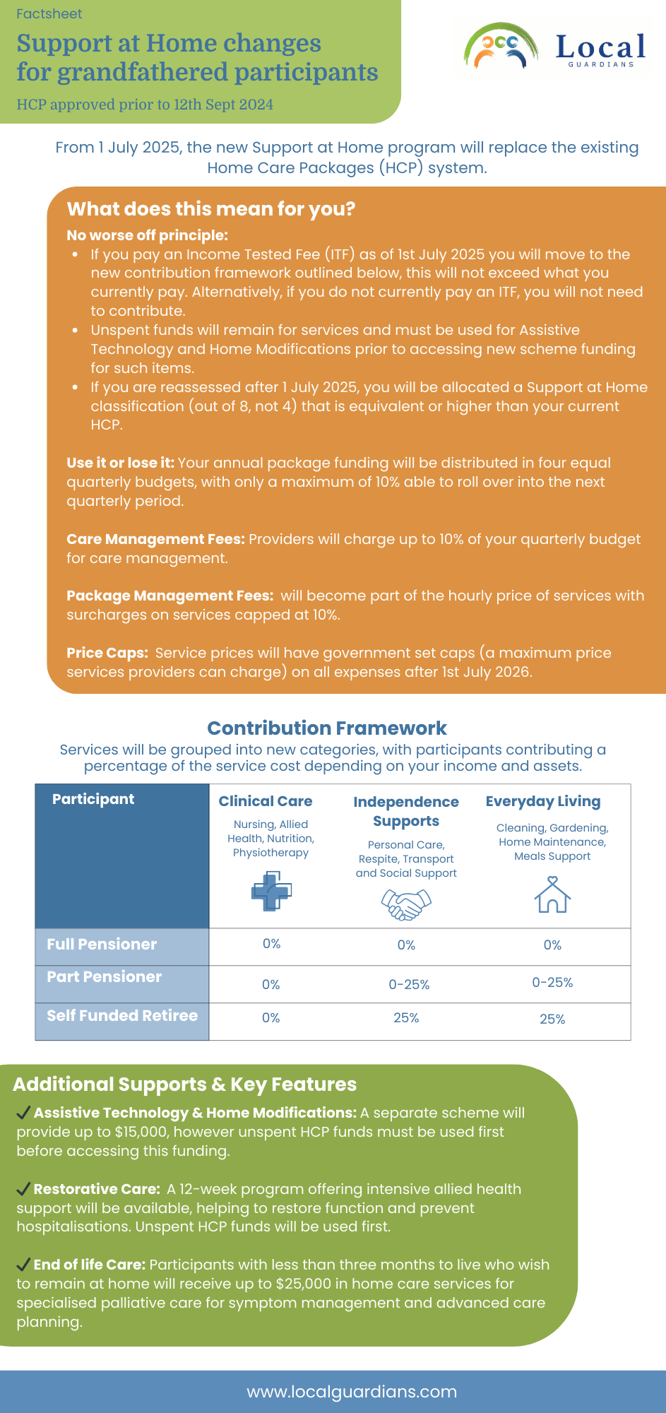 If you have a Home Care Package that was approved before 12th September 2024 you are considered a ‘Grandfathered Participant’ under the new Support at Home Program.